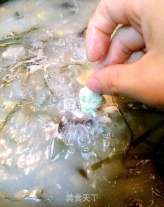 将海带,花生,木耳,粉条,黄豆倒入锅中加水大火煮开,加盐,再煮5分钟,汤色成奶白色。