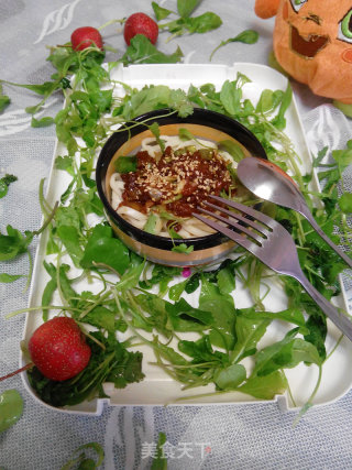 面条煮熟后过凉水,浇上刚炸好的酱,开吃!