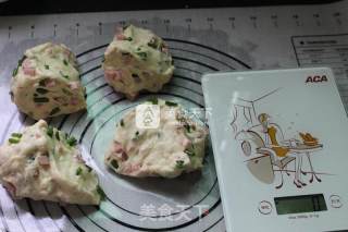 发酵面团的过程我们来准备馅料。将火腿、香葱各切成丁