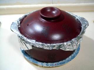 在砂锅上蒙上一块铝箔纸,先盖好砂锅的盖子,盖子盖严按牢。