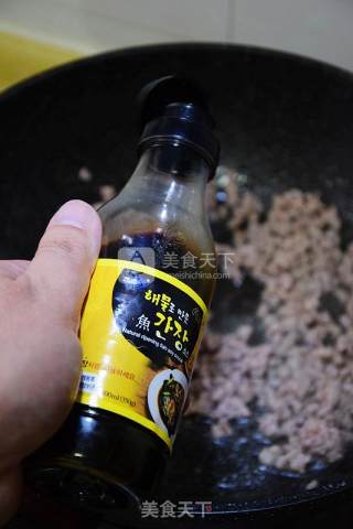 再将辣椒粉和花椒粉倒入锅中继续小火炒制,再烹入少许韩式酱油;