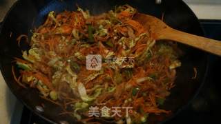 白菜、青椒切细丝,胡萝卜用擦丝器擦成丝,牛里脊切成条