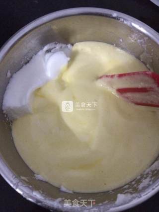 刮三分之一的蛋清与面糊搅拌均用,采用上下翻动的手法