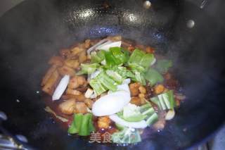 开锅盖,下入大葱葱白和青椒片,转大火颠锅翻炒,此时要多翻炒几次,顺带收汁。