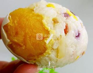 把混合好的糯米装进取好蛋白的蛋壳里面,边装边用筷子把糯米压紧