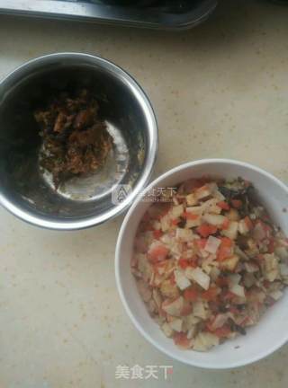 豆腐(要选老豆腐)切成0.5公分大小的丁块备用。