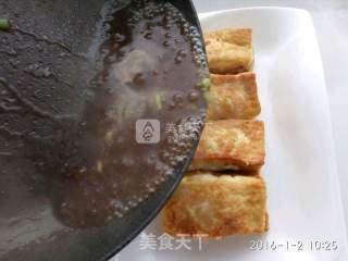 锅内加入多一些植物油,把灌入肉馅的豆腐下入锅中煎炸