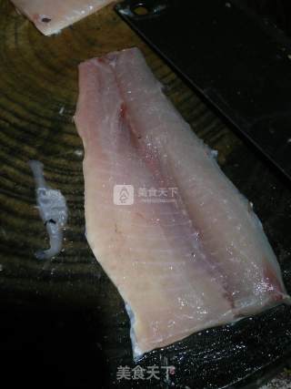 先切下自己想要的鱼块的大小(大概),然后在刚刚显示的鱼背肉与鱼腩肉的分隔处,用刀放在分隔处打横并偏向斜下切下去,将有细小骨的鱼背肉整块切出来(这个是技巧所在,如果不确定的话可以用手摸一下鱼肉边缘的鱼背肉,会很容易的感觉到有骨刺出来,下刀时一定要偏斜下,这样就能只切了背上有骨的那一块肉),然后剩下的右边的鱼肉就是没有骨头的纯肉。