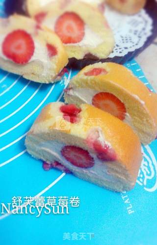 烤好的蛋糕片出箱后倒扣在新的一张油纸上,把之前的油纸盖上,以免在放置晾凉时发干,在不烫手的时候就可以把淡奶油抹上去,上端尾部不抹留出一点,摆上草莓,卷起,冰箱冷藏半小时以上,切片。