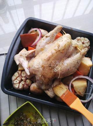 鸡表面抹一层厚厚的香料黄油,入烤盘,,剩下的配菜围在鸡的周围