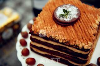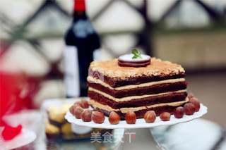 盖上另外一片蛋糕,再将蛋糕片上刷上朗姆酒糖浆,挤上榛子奶油馅。