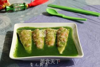 这道菜不仅营养丰富,味道鲜美,而且还很养眼。翡翠虾滑醸竹笋,虾滑搅打上劲后再醸入鲜嫩的笋尖里蒸熟,再淋上汁水即可。喜欢的可以试试做做。 ”