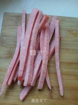 火腿肠去皮切条。米饭蒸熟加一点盐拌匀。