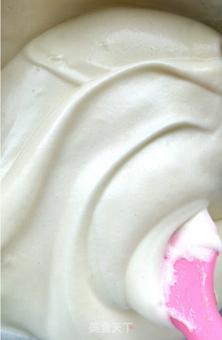 接下来打发蛋清。辅料中的蛋清加入少许柠檬汁或白醋,分三次加糖后打发至拉出大弯钩的状态