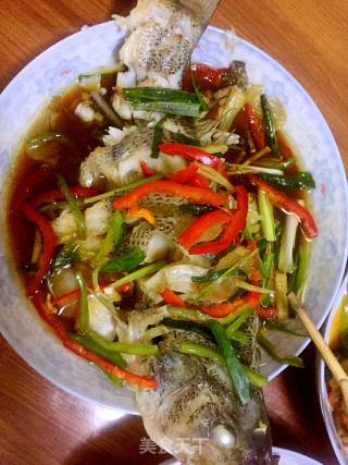 撒青红椒丝、葱姜丝在蒸好的鱼身上!然后热锅热葱姜蒜油,趁热 油淋在鱼身上就OK