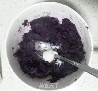 趁压南瓜泥的时间,将紫薯去皮洗净切小丁并送入微波炉,高火打12分钟