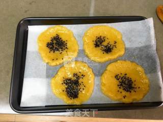 将小剂子搓圆压扁,面上撒熟芝麻。再刷一层蛋液!
