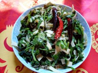 接着倒入百叶丝,继续快速翻炒几下。接着,加盐,加蔬菜精,再翻炒几下就好了,关火,准备出锅
