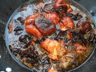 把高压锅中的炖鸡倒入炒勺中,放香菇、木耳,再炖制10分钟,大火收收汁儿。