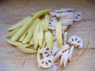 土豆和莲藕去皮洗净,土豆切粗条,莲藕切片,用清水洗去土豆和莲藕表面的淀粉,沥干水分。