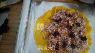 把肉馅平摊在鸡蛋饼上,要摊的均匀,接着放入少量紫菜。