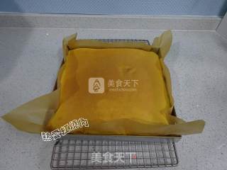 时间到马上取出烤盘将蛋糕体倒扣到铺了油纸的烤网上,撕去油纸再把油纸盖在蛋糕体上稍微晾凉。