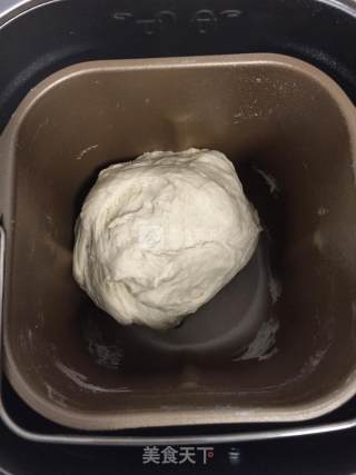 将水、面粉依次放入面包桶内,面粉中间挖洞放入酵母,面粉四角放点盐、白糖,启动和面程序和面,然后启动发酵程序发酵一小时,再启动和面程序和面5分钟排气;