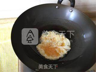 1.炒蛋的时候不要急着翻炒,因为这个菜需要蛋是块状的,但是也不要炒焦了,转动炒锅,等差不多凝固的时候翻炒下,全部凝固后用铲子把蛋打破成块状,然后炒制两面金黄.
