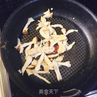先下鸡丝翻炒再下杏鲍菇,加适量蒸鱼豉油,大火煸干
