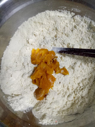 第一步要用中小火,不要炒糊。南瓜出水多,所以添加水的时候要少量多次的加入,直到能做出软硬适中的面团来。我做的有些偏干,以后再改进。
