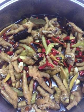 煮好后捞出鸡脚洗净,放盆里开细水冲40分钟,在这个时间里,把泡椒(连水一块)小米辣(切段)加5克冰糖,倒入生抽,50克白醋,5克鸡精,一碗纯净水,搅匀,把朝天椒同花椒一起在锅里炒香,把辣椒使劲的按在锅底(直至有一点糊),加一点水熬10分钟冷却,加到前面的配料里面,把冲好鸡脚放进去搅匀密封好,放冰箱冷藏一夜后可以开吃咯