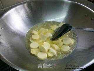 锅里下油烧热,倒入豆腐。慢慢兜匀。
