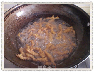 将猪肉条放在油内炸。