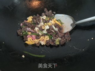 牛肉切片,调入盐、酱油、黑胡椒碎、生粉。