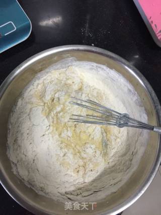 1用少量水稀释孝母后,倒入牛奶,盐、糖、橄榄油、蛋清,用手动打蛋器搅匀、先后两次倒入面粉搅拌,