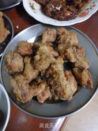 裹沾均匀事先备好的淀粉加白面粉调好的浓浆入锅,中火炸酥,大火上色。