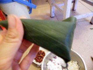 粽叶卷成圆锥状,放入西米和2中的一种或几种,不要都掺在一起。用的时候再放。