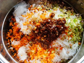 粉丝切小段,香菇,卷心菜,胡萝卜,木耳,分别切碎粒。