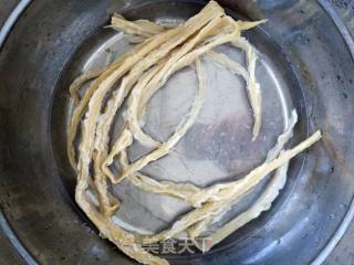 泡好的腐竹切段与小豆芽一同在开水里煮两三分钟水开即可