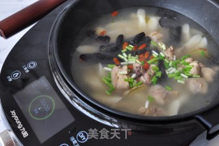 在九阳IH智能炒菜机J9内放入两片姜,50克泡发后的木耳,200克山药和焯过水的琵琶腿。