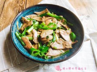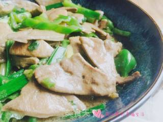 青椒变软后加入刚才的猪肝大火翻炒几下,加入鸡精再翻几下即可。。