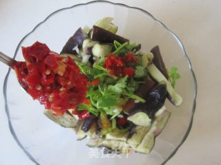 “ 今天我就给大家推荐一道清爽的凉拌小菜---剁椒香菜拌茄子, 这菜不用开火, 不用一滴油, 还不加盐,但味道却一点不打折。先选用适合凉拌的长条茄, 切成细长条后就可放入微波炉中打熟了,这样不用开火无油烟;做熟的茄子, 拌入香菜、蒜末、蒸鱼豉油和剁椒等调味料, 由于蒸鱼豉油和剁椒都含比较大的咸味, 因此连盐都省了。这是我家夏日餐桌经常会出现的一道家常小凉菜,口感香鲜软嫩,非常的好吃。 ”
