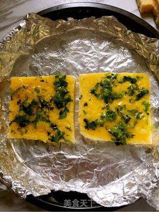 准备两土司片切掉边、香菜叶和室温软化的黄油、蒜蓉、一点盐调匀