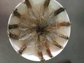 虾洗净剪去须脚、在背部用剪刀剪开去除虾线、用刀在虾的身上轻轻剁几下