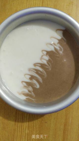 将打好的奶油分两份倒入黑白巧克力碗里,之后搅拌均匀