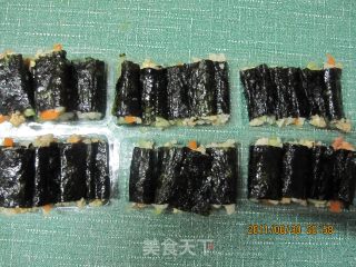 卷帘铺好,把紫菜一片片的放在上面,我买的都是一小包的,一片片分开来的,省的再切了。先铺上一层米饭,再均匀的放上黄瓜、胡萝卜和鸡蛋(鸡蛋要先放入一些味极鲜拌匀,这样的紫菜包饭很鲜美,一定要放味极鲜,味道立马不同,呵呵)