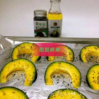 南瓜切开去瓤、烤盘铺好锡纸刷好黑芝麻牛油果油