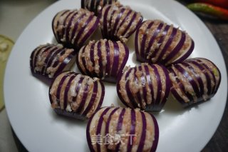 肉末放入盐与酱油腌10分钟,加入淀粉搅拌均匀。把肉末一点一点塞入茄子中,好像个小灯笼。