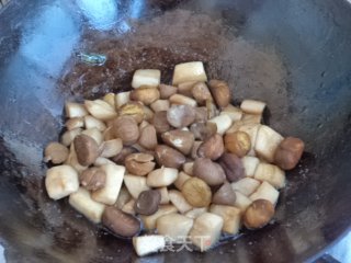 “ 买了炒的香香的遵化油栗,没有及时吃掉,放的失去了原有的口感与味道,改变吃法,用来炒了这道油焖栗子菇。菇选用的是杏鲍菇。这道菜的做法近似于油焖栗子鸡,只是将鸡肉换成了杏鲍菇。菜品里虽然少了鸡肉,但味道同样是非常好。栗子营养丰富,有“干果之王”的美称。能补脾健胃、补肾强筋,得益于栗子的营养成分及诸多功效,再配上同样利好的杏鲍菇,这道菜美味又保健。 ”