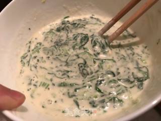 将面粉,鸡蛋,青菜碎倒入碗中加适量盐和水搅拌成面糊,也可以调入适量香油。